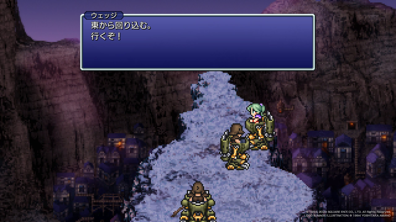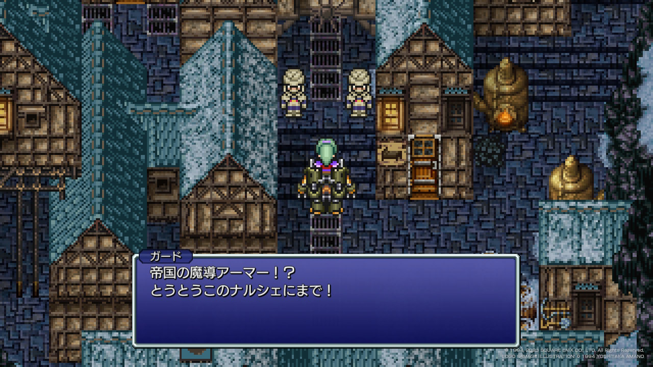 初回、魔導アーマーでナルシェ襲撃したときは、情け容赦なく警備兵とワンちゃん攻撃してて、なかなか残忍すぎ引いてしまった。でも、魔導アーマー便利じゃない???一生乗って旅したい。で、ビッグスとウェッジどこへやった???